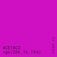 Цвет #CE10C2 в цветовой модели RGB обозначается тремя октетами (206, 16, 194) в десятичном формате и #CE10C2 в шестнадцатиричном (hex) формате, которые являются интенсивностью красного 206 (hex CE), интенсивность зелёного 16 (hex 10) и интенсивность синего 194 (hex C2).