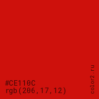 Цвет #CE110C в цветовой модели RGB обозначается тремя октетами (206, 17, 12) в десятичном формате и #CE110C в шестнадцатиричном (hex) формате, которые являются интенсивностью красного 206 (hex CE), интенсивность зелёного 17 (hex 11) и интенсивность синего 12 (hex 0C).