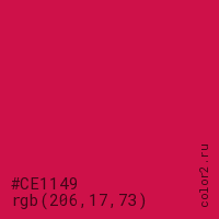 Цвет #CE1149 в цветовой модели RGB обозначается тремя октетами (206, 17, 73) в десятичном формате и #CE1149 в шестнадцатиричном (hex) формате, которые являются интенсивностью красного 206 (hex CE), интенсивность зелёного 17 (hex 11) и интенсивность синего 73 (hex 49).
