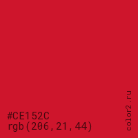 Цвет #CE152C в цветовой модели RGB обозначается тремя октетами (206, 21, 44) в десятичном формате и #CE152C в шестнадцатиричном (hex) формате, которые являются интенсивностью красного 206 (hex CE), интенсивность зелёного 21 (hex 15) и интенсивность синего 44 (hex 2C).