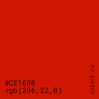 Цвет #CE1600 в цветовой модели RGB обозначается тремя октетами (206, 22, 0) в десятичном формате и #CE1600 в шестнадцатиричном (hex) формате, которые являются интенсивностью красного 206 (hex CE), интенсивность зелёного 22 (hex 16) и интенсивность синего 0 (hex 00).