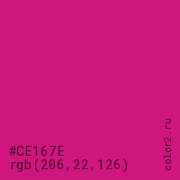 Цвет #CE167E в цветовой модели RGB обозначается тремя октетами (206, 22, 126) в десятичном формате и #CE167E в шестнадцатиричном (hex) формате, которые являются интенсивностью красного 206 (hex CE), интенсивность зелёного 22 (hex 16) и интенсивность синего 126 (hex 7E).