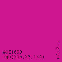 Цвет #CE1690 в цветовой модели RGB обозначается тремя октетами (206, 22, 144) в десятичном формате и #CE1690 в шестнадцатиричном (hex) формате, которые являются интенсивностью красного 206 (hex CE), интенсивность зелёного 22 (hex 16) и интенсивность синего 144 (hex 90).