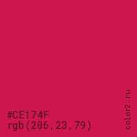 Цвет #CE174F в цветовой модели RGB обозначается тремя октетами (206, 23, 79) в десятичном формате и #CE174F в шестнадцатиричном (hex) формате, которые являются интенсивностью красного 206 (hex CE), интенсивность зелёного 23 (hex 17) и интенсивность синего 79 (hex 4F).