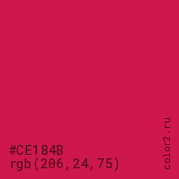 Цвет #CE184B в цветовой модели RGB обозначается тремя октетами (206, 24, 75) в десятичном формате и #CE184B в шестнадцатиричном (hex) формате, которые являются интенсивностью красного 206 (hex CE), интенсивность зелёного 24 (hex 18) и интенсивность синего 75 (hex 4B).
