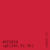 Цвет #CE2038 в цветовой модели RGB обозначается тремя октетами (206, 32, 56) в десятичном формате и #CE2038 в шестнадцатиричном (hex) формате, которые являются интенсивностью красного 206 (hex CE), интенсивность зелёного 32 (hex 20) и интенсивность синего 56 (hex 38).