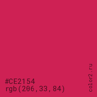 Цвет #CE2154 в цветовой модели RGB обозначается тремя октетами (206, 33, 84) в десятичном формате и #CE2154 в шестнадцатиричном (hex) формате, которые являются интенсивностью красного 206 (hex CE), интенсивность зелёного 33 (hex 21) и интенсивность синего 84 (hex 54).