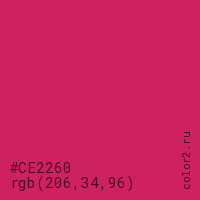 Цвет #CE2260 в цветовой модели RGB обозначается тремя октетами (206, 34, 96) в десятичном формате и #CE2260 в шестнадцатиричном (hex) формате, которые являются интенсивностью красного 206 (hex CE), интенсивность зелёного 34 (hex 22) и интенсивность синего 96 (hex 60).