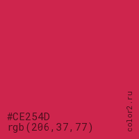 Цвет #CE254D в цветовой модели RGB обозначается тремя октетами (206, 37, 77) в десятичном формате и #CE254D в шестнадцатиричном (hex) формате, которые являются интенсивностью красного 206 (hex CE), интенсивность зелёного 37 (hex 25) и интенсивность синего 77 (hex 4D).