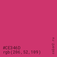 Цвет #CE346D в цветовой модели RGB обозначается тремя октетами (206, 52, 109) в десятичном формате и #CE346D в шестнадцатиричном (hex) формате, которые являются интенсивностью красного 206 (hex CE), интенсивность зелёного 52 (hex 34) и интенсивность синего 109 (hex 6D).