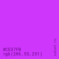 Цвет #CE37FB в цветовой модели RGB обозначается тремя октетами (206, 55, 251) в десятичном формате и #CE37FB в шестнадцатиричном (hex) формате, которые являются интенсивностью красного 206 (hex CE), интенсивность зелёного 55 (hex 37) и интенсивность синего 251 (hex FB).