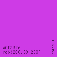 Цвет #CE3BE6 в цветовой модели RGB обозначается тремя октетами (206, 59, 230) в десятичном формате и #CE3BE6 в шестнадцатиричном (hex) формате, которые являются интенсивностью красного 206 (hex CE), интенсивность зелёного 59 (hex 3B) и интенсивность синего 230 (hex E6).