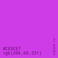 Цвет #CE3CE7 в цветовой модели RGB обозначается тремя октетами (206, 60, 231) в десятичном формате и #CE3CE7 в шестнадцатиричном (hex) формате, которые являются интенсивностью красного 206 (hex CE), интенсивность зелёного 60 (hex 3C) и интенсивность синего 231 (hex E7).