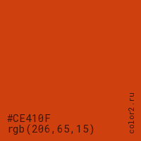 Цвет #CE410F в цветовой модели RGB обозначается тремя октетами (206, 65, 15) в десятичном формате и #CE410F в шестнадцатиричном (hex) формате, которые являются интенсивностью красного 206 (hex CE), интенсивность зелёного 65 (hex 41) и интенсивность синего 15 (hex 0F).