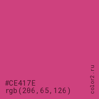 Цвет #CE417E в цветовой модели RGB обозначается тремя октетами (206, 65, 126) в десятичном формате и #CE417E в шестнадцатиричном (hex) формате, которые являются интенсивностью красного 206 (hex CE), интенсивность зелёного 65 (hex 41) и интенсивность синего 126 (hex 7E).