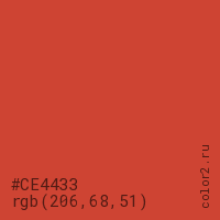 Цвет #CE4433 в цветовой модели RGB обозначается тремя октетами (206, 68, 51) в десятичном формате и #CE4433 в шестнадцатиричном (hex) формате, которые являются интенсивностью красного 206 (hex CE), интенсивность зелёного 68 (hex 44) и интенсивность синего 51 (hex 33).