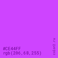 Цвет #CE44FF в цветовой модели RGB обозначается тремя октетами (206, 68, 255) в десятичном формате и #CE44FF в шестнадцатиричном (hex) формате, которые являются интенсивностью красного 206 (hex CE), интенсивность зелёного 68 (hex 44) и интенсивность синего 255 (hex FF).