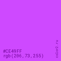 Цвет #CE49FF в цветовой модели RGB обозначается тремя октетами (206, 73, 255) в десятичном формате и #CE49FF в шестнадцатиричном (hex) формате, которые являются интенсивностью красного 206 (hex CE), интенсивность зелёного 73 (hex 49) и интенсивность синего 255 (hex FF).