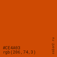 Цвет #CE4A03 в цветовой модели RGB обозначается тремя октетами (206, 74, 3) в десятичном формате и #CE4A03 в шестнадцатиричном (hex) формате, которые являются интенсивностью красного 206 (hex CE), интенсивность зелёного 74 (hex 4A) и интенсивность синего 3 (hex 03).