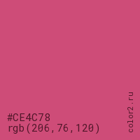 Цвет #CE4C78 в цветовой модели RGB обозначается тремя октетами (206, 76, 120) в десятичном формате и #CE4C78 в шестнадцатиричном (hex) формате, которые являются интенсивностью красного 206 (hex CE), интенсивность зелёного 76 (hex 4C) и интенсивность синего 120 (hex 78).