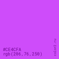 Цвет #CE4CFA в цветовой модели RGB обозначается тремя октетами (206, 76, 250) в десятичном формате и #CE4CFA в шестнадцатиричном (hex) формате, которые являются интенсивностью красного 206 (hex CE), интенсивность зелёного 76 (hex 4C) и интенсивность синего 250 (hex FA).
