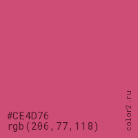 Цвет #CE4D76 в цветовой модели RGB обозначается тремя октетами (206, 77, 118) в десятичном формате и #CE4D76 в шестнадцатиричном (hex) формате, которые являются интенсивностью красного 206 (hex CE), интенсивность зелёного 77 (hex 4D) и интенсивность синего 118 (hex 76).