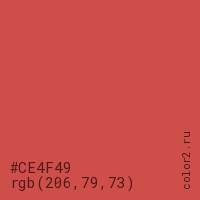 Цвет #CE4F49 в цветовой модели RGB обозначается тремя октетами (206, 79, 73) в десятичном формате и #CE4F49 в шестнадцатиричном (hex) формате, которые являются интенсивностью красного 206 (hex CE), интенсивность зелёного 79 (hex 4F) и интенсивность синего 73 (hex 49).