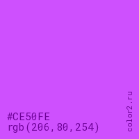 Цвет #CE50FE в цветовой модели RGB обозначается тремя октетами (206, 80, 254) в десятичном формате и #CE50FE в шестнадцатиричном (hex) формате, которые являются интенсивностью красного 206 (hex CE), интенсивность зелёного 80 (hex 50) и интенсивность синего 254 (hex FE).