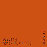 Цвет #CE5114 в цветовой модели RGB обозначается тремя октетами (206, 81, 20) в десятичном формате и #CE5114 в шестнадцатиричном (hex) формате, которые являются интенсивностью красного 206 (hex CE), интенсивность зелёного 81 (hex 51) и интенсивность синего 20 (hex 14).