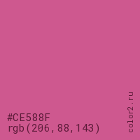 Цвет #CE588F в цветовой модели RGB обозначается тремя октетами (206, 88, 143) в десятичном формате и #CE588F в шестнадцатиричном (hex) формате, которые являются интенсивностью красного 206 (hex CE), интенсивность зелёного 88 (hex 58) и интенсивность синего 143 (hex 8F).