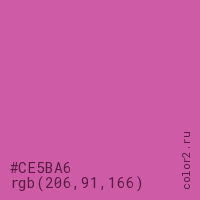 Цвет #CE5BA6 в цветовой модели RGB обозначается тремя октетами (206, 91, 166) в десятичном формате и #CE5BA6 в шестнадцатиричном (hex) формате, которые являются интенсивностью красного 206 (hex CE), интенсивность зелёного 91 (hex 5B) и интенсивность синего 166 (hex A6).