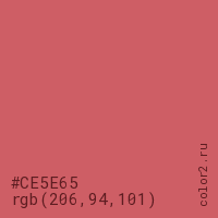 Цвет #CE5E65 в цветовой модели RGB обозначается тремя октетами (206, 94, 101) в десятичном формате и #CE5E65 в шестнадцатиричном (hex) формате, которые являются интенсивностью красного 206 (hex CE), интенсивность зелёного 94 (hex 5E) и интенсивность синего 101 (hex 65).