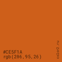 Цвет #CE5F1A в цветовой модели RGB обозначается тремя октетами (206, 95, 26) в десятичном формате и #CE5F1A в шестнадцатиричном (hex) формате, которые являются интенсивностью красного 206 (hex CE), интенсивность зелёного 95 (hex 5F) и интенсивность синего 26 (hex 1A).