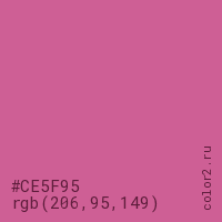 Цвет #CE5F95 в цветовой модели RGB обозначается тремя октетами (206, 95, 149) в десятичном формате и #CE5F95 в шестнадцатиричном (hex) формате, которые являются интенсивностью красного 206 (hex CE), интенсивность зелёного 95 (hex 5F) и интенсивность синего 149 (hex 95).
