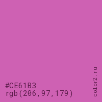 Цвет #CE61B3 в цветовой модели RGB обозначается тремя октетами (206, 97, 179) в десятичном формате и #CE61B3 в шестнадцатиричном (hex) формате, которые являются интенсивностью красного 206 (hex CE), интенсивность зелёного 97 (hex 61) и интенсивность синего 179 (hex B3).