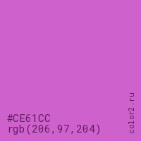 Цвет #CE61CC в цветовой модели RGB обозначается тремя октетами (206, 97, 204) в десятичном формате и #CE61CC в шестнадцатиричном (hex) формате, которые являются интенсивностью красного 206 (hex CE), интенсивность зелёного 97 (hex 61) и интенсивность синего 204 (hex CC).