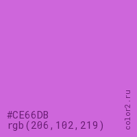Цвет #CE66DB в цветовой модели RGB обозначается тремя октетами (206, 102, 219) в десятичном формате и #CE66DB в шестнадцатиричном (hex) формате, которые являются интенсивностью красного 206 (hex CE), интенсивность зелёного 102 (hex 66) и интенсивность синего 219 (hex DB).