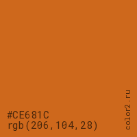 Цвет #CE681C в цветовой модели RGB обозначается тремя октетами (206, 104, 28) в десятичном формате и #CE681C в шестнадцатиричном (hex) формате, которые являются интенсивностью красного 206 (hex CE), интенсивность зелёного 104 (hex 68) и интенсивность синего 28 (hex 1C).