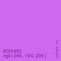 Цвет #CE68EC в цветовой модели RGB обозначается тремя октетами (206, 104, 236) в десятичном формате и #CE68EC в шестнадцатиричном (hex) формате, которые являются интенсивностью красного 206 (hex CE), интенсивность зелёного 104 (hex 68) и интенсивность синего 236 (hex EC).