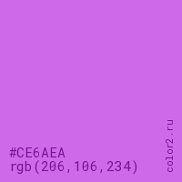 Цвет #CE6AEA в цветовой модели RGB обозначается тремя октетами (206, 106, 234) в десятичном формате и #CE6AEA в шестнадцатиричном (hex) формате, которые являются интенсивностью красного 206 (hex CE), интенсивность зелёного 106 (hex 6A) и интенсивность синего 234 (hex EA).