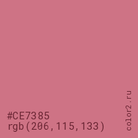 Цвет #CE7385 в цветовой модели RGB обозначается тремя октетами (206, 115, 133) в десятичном формате и #CE7385 в шестнадцатиричном (hex) формате, которые являются интенсивностью красного 206 (hex CE), интенсивность зелёного 115 (hex 73) и интенсивность синего 133 (hex 85).