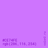 Цвет #CE74FE в цветовой модели RGB обозначается тремя октетами (206, 116, 254) в десятичном формате и #CE74FE в шестнадцатиричном (hex) формате, которые являются интенсивностью красного 206 (hex CE), интенсивность зелёного 116 (hex 74) и интенсивность синего 254 (hex FE).