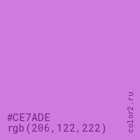 Цвет #CE7ADE в цветовой модели RGB обозначается тремя октетами (206, 122, 222) в десятичном формате и #CE7ADE в шестнадцатиричном (hex) формате, которые являются интенсивностью красного 206 (hex CE), интенсивность зелёного 122 (hex 7A) и интенсивность синего 222 (hex DE).