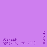 Цвет #CE7EEF в цветовой модели RGB обозначается тремя октетами (206, 126, 239) в десятичном формате и #CE7EEF в шестнадцатиричном (hex) формате, которые являются интенсивностью красного 206 (hex CE), интенсивность зелёного 126 (hex 7E) и интенсивность синего 239 (hex EF).