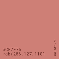 Цвет #CE7F76 в цветовой модели RGB обозначается тремя октетами (206, 127, 118) в десятичном формате и #CE7F76 в шестнадцатиричном (hex) формате, которые являются интенсивностью красного 206 (hex CE), интенсивность зелёного 127 (hex 7F) и интенсивность синего 118 (hex 76).