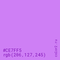 Цвет RGB(206, 127, 245) в процентом отношении количества цвета состоит из 80.8% красного (red), 49.8% зелёного (green) и 96.1% синего (blue).