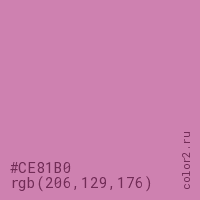 Цвет #CE81B0 в цветовой модели RGB обозначается тремя октетами (206, 129, 176) в десятичном формате и #CE81B0 в шестнадцатиричном (hex) формате, которые являются интенсивностью красного 206 (hex CE), интенсивность зелёного 129 (hex 81) и интенсивность синего 176 (hex B0).