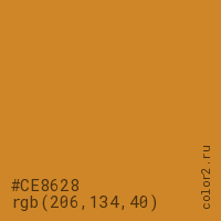Цвет #CE8628 в цветовой модели RGB обозначается тремя октетами (206, 134, 40) в десятичном формате и #CE8628 в шестнадцатиричном (hex) формате, которые являются интенсивностью красного 206 (hex CE), интенсивность зелёного 134 (hex 86) и интенсивность синего 40 (hex 28).