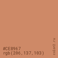 Цвет #CE8967 в цветовой модели RGB обозначается тремя октетами (206, 137, 103) в десятичном формате и #CE8967 в шестнадцатиричном (hex) формате, которые являются интенсивностью красного 206 (hex CE), интенсивность зелёного 137 (hex 89) и интенсивность синего 103 (hex 67).