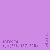 Цвет #CE89E4 в цветовой модели RGB обозначается тремя октетами (206, 137, 228) в десятичном формате и #CE89E4 в шестнадцатиричном (hex) формате, которые являются интенсивностью красного 206 (hex CE), интенсивность зелёного 137 (hex 89) и интенсивность синего 228 (hex E4).